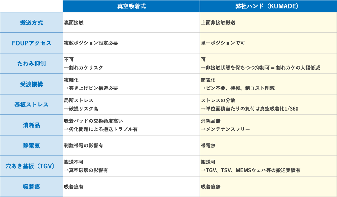 KUMADEは、上面から非接触搬送を実現することで、FOUP内の基板に対して安定したアクセスが可能となり、搬送工程の信頼性と効率性を向上させます。-